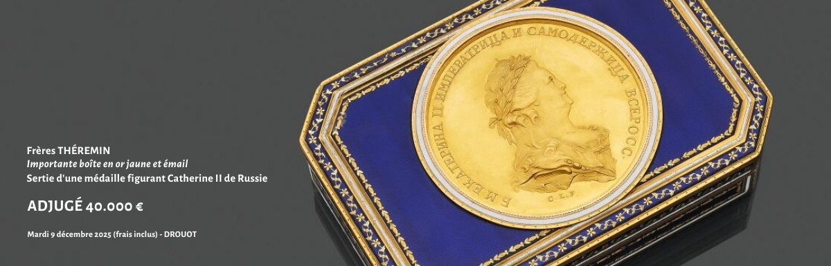 Une vacation récente, tenue le 9 décembre 2025, a vu la vente pour un montant de 46.000€ d'une importante boîte en or jaune et émail, figurant une médaille à l'effigie de Catherine II de Russie.